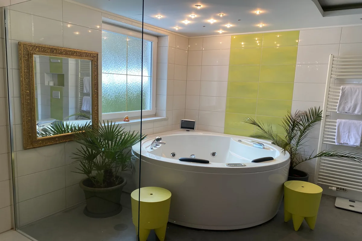 Ein absolutes Highlight ist das riesige Badezimmer mit Doppel-Whirlwanne. Hier finden Sie die perfekte Umgebung, um sich zu erfrischen und zu verwöhnen. Lehnen Sie sich zurück und genießen Sie Ihren Urlaub.